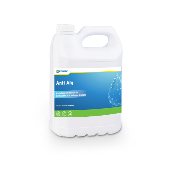 Zodiac Anti Alghe è un prodotto liquido specifico per prevenire e contrastare la formazione di alghe sulle pareti e sul fondo della piscina. La sua formula a base di composti polimerici di ammonio quaternario (concentrati al 10-15%) garantisce un’azione efficace e duratura contro le proliferazioni algali.