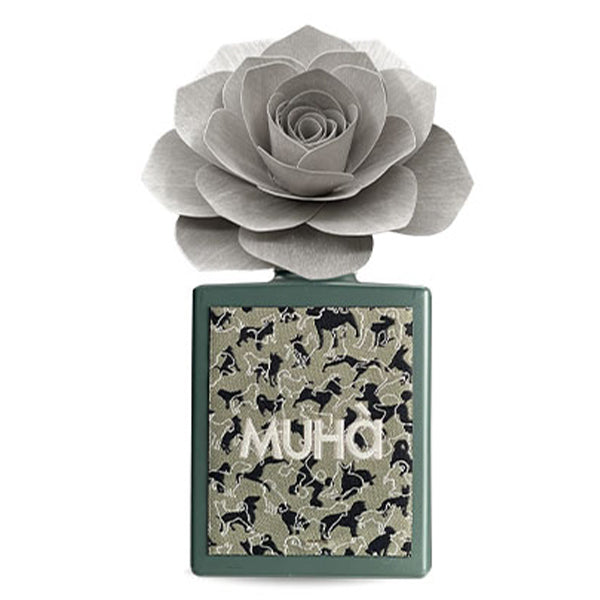 Profumatore per ambiente presentato in una raffinata bottiglia di vetro verniciato, impreziosita da un'etichetta tessuta in jacquard. Il diffusore è a forma di fiore, realizzato a mano in legno di betulla naturale. Completo di essenza.