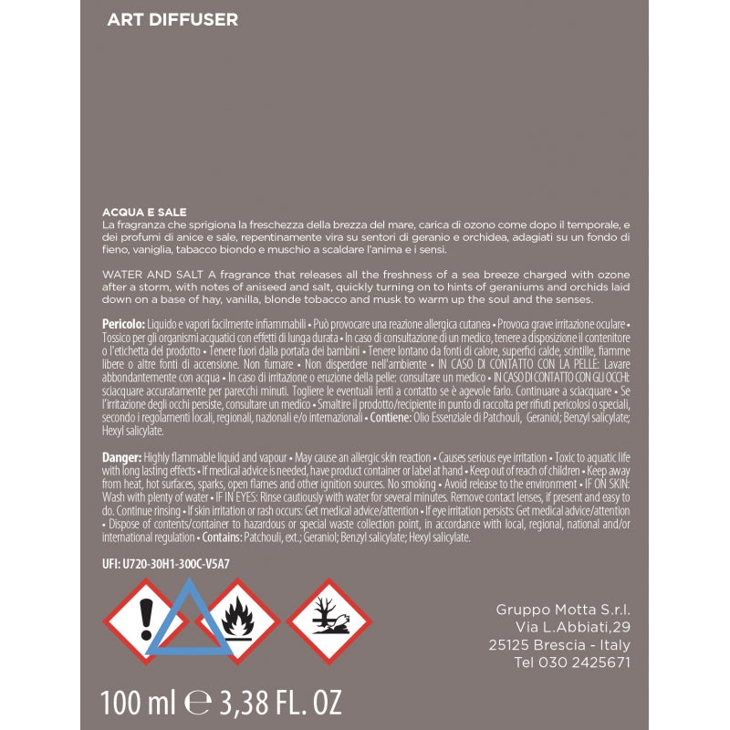 • Fragranza Unica: La fragranza Acqua e Sale evoca la freschezza della brezza marina, combinata con profumi di anice, geranio, orchidea, fieno, vaniglia, tabacco biondo e muschio.
