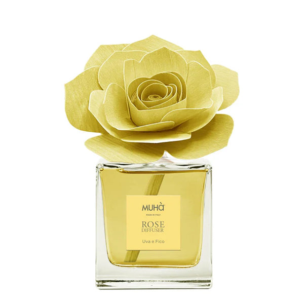 - Contenitore: Bottiglia di vetro con diffusore a forma di rosa in legno di betulla