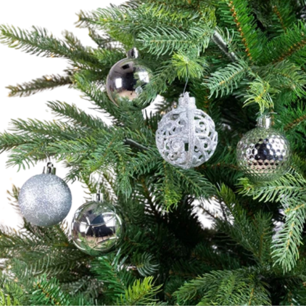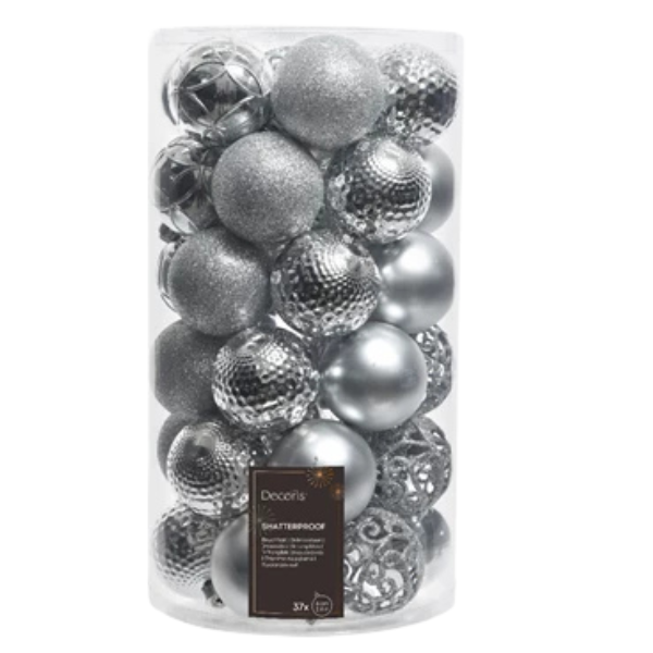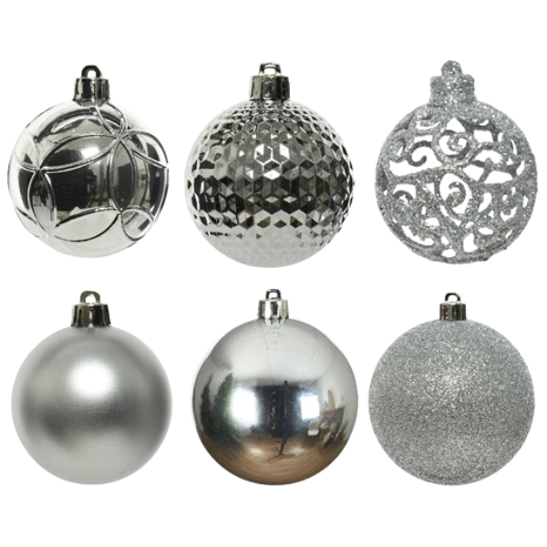 Set di 37 Palline di Natale da 6 cm in Argento – Shiny, Matt, Glitter e Decorate