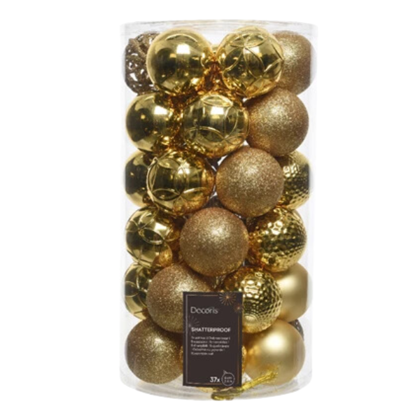 Set di 37 Palline di Natale da 6 cm in Oro – Shiny, Matt, Glitter e Decorate