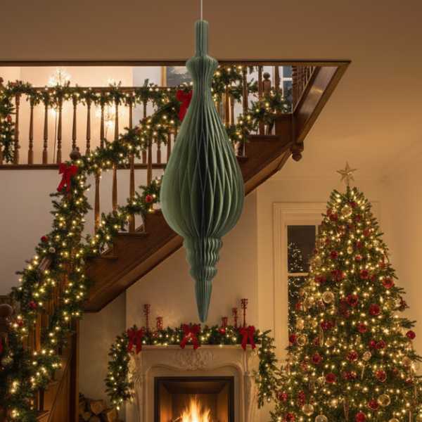 Decorazione Natalizia in Carta Verde – Ø 22 cm H 80 cm, Bordo Champagne, con Appendino