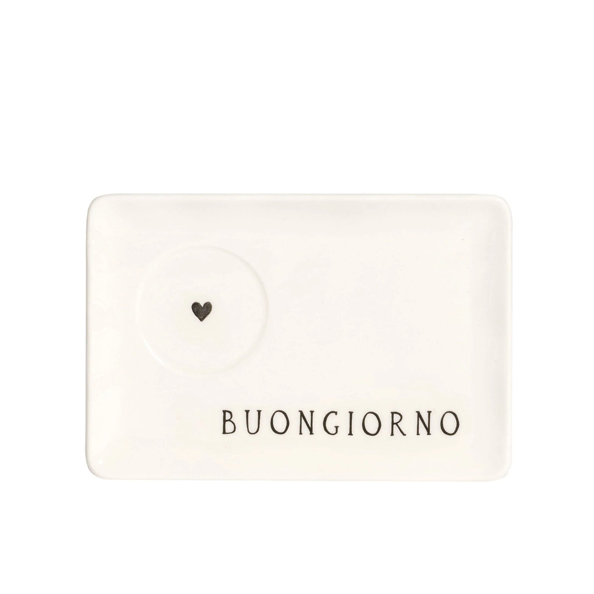Il “Buongiorno” è il gesto che dà inizio ad ogni mattina. Con questo set di 2 piattini per tazzine espresso potrai accompagnare il tuo caffè con un messaggio speciale, perfetto da abbinare alle tazze della stessa linea per creare un servizio unico e tutto tuo.